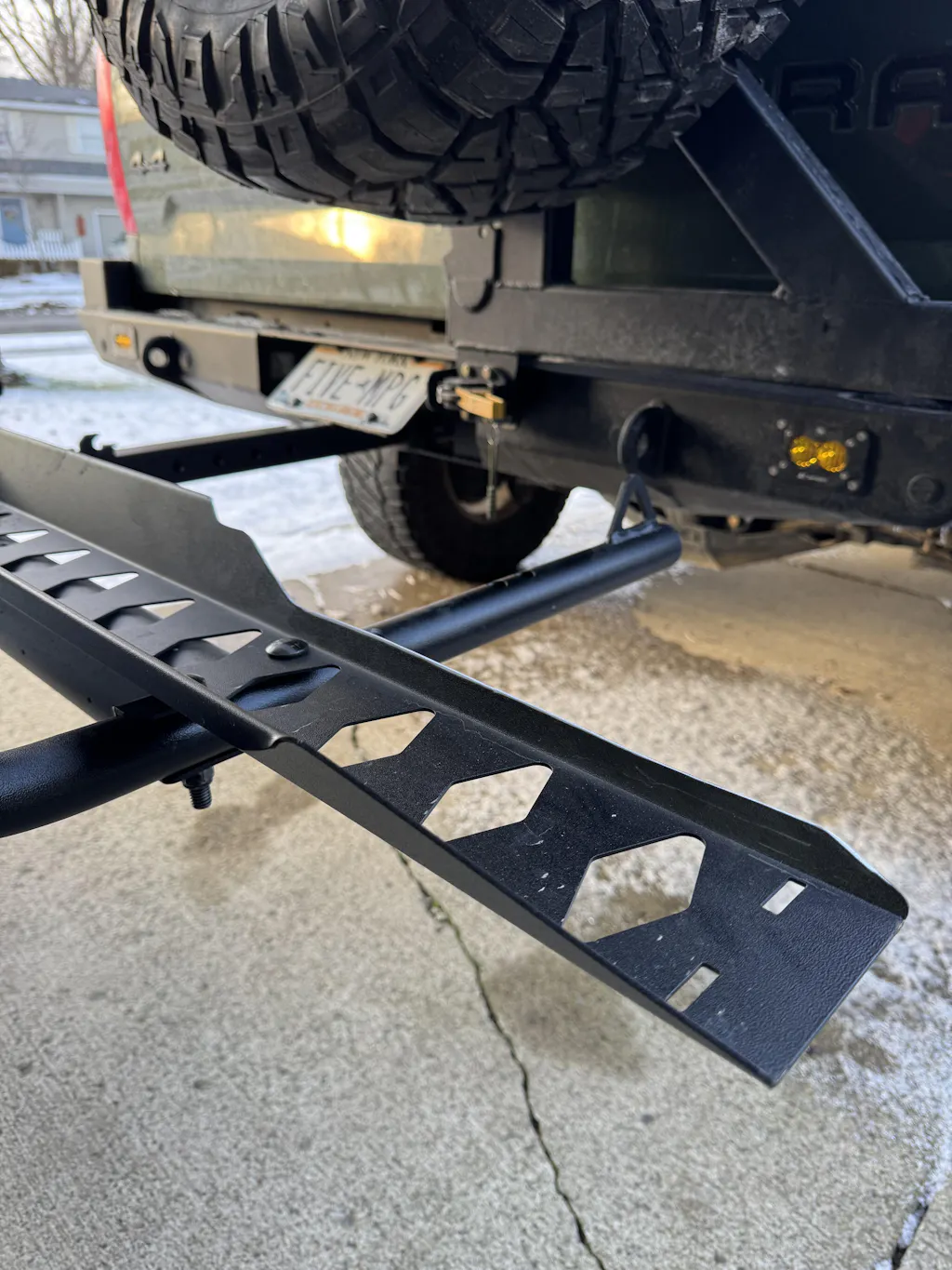 Innovative 2" receiver tube counteracts common vehicle hitch droop with a slight upward bend, ensuring that the rack is angled correctly from the back of the vehicle. Provides additional ground clearance, attachment of ramp and distance from vehicle adjustability.