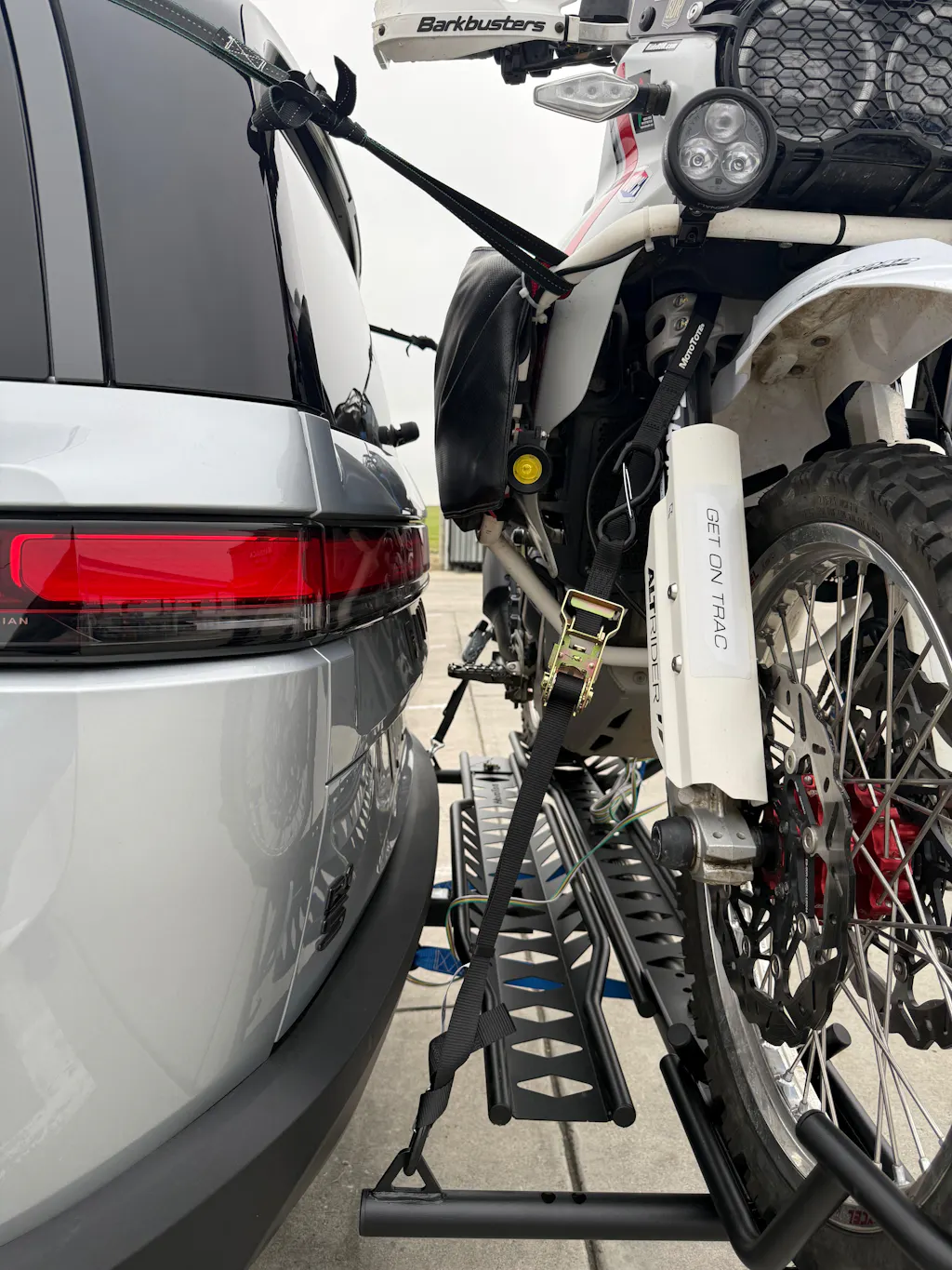 Two wide tie-down arms maximize tie down leverage on the front and rear of the motorcycle. Patented shape increases carrier clearance on hills and off-road.